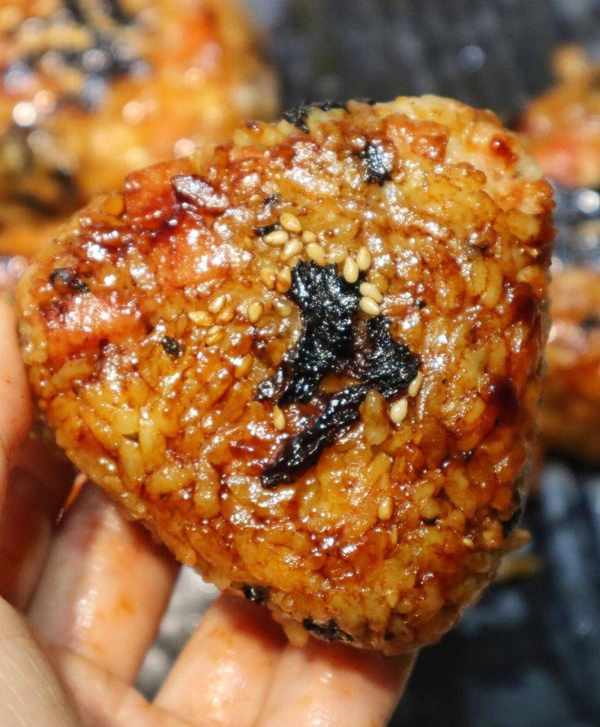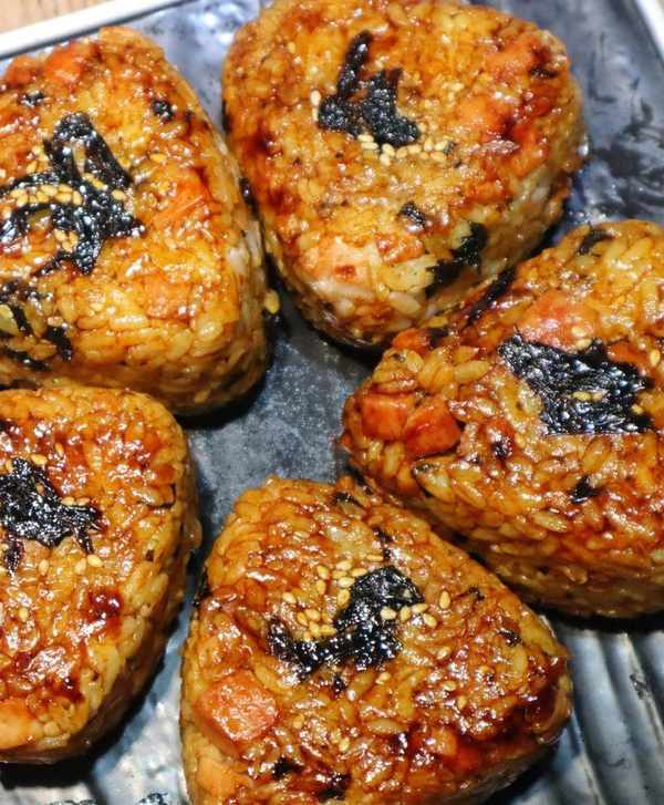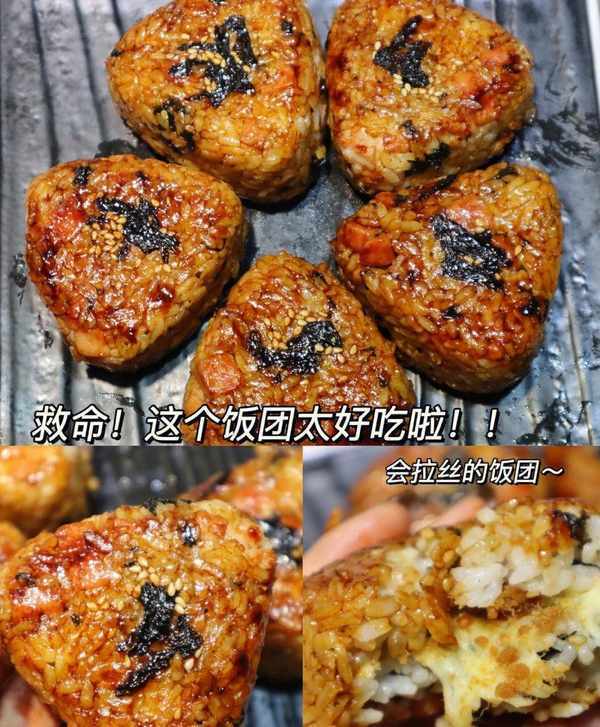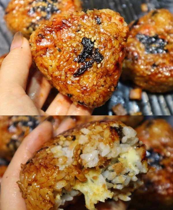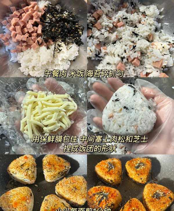 制作方法非常簡單,首先制作調料汁,將生抽、蠔油、番茄醬和蜂蜜混合,加入適量的水,攪拌均勻。將米飯和海苔碎和午餐肉丁混合,捏成一塊小飯團。中間放上肉松和芝士碎,用保鮮膜包裹捏成飯團。在平底鍋裡倒油,用小火煎飯團,每面煎1分鐘後均勻地刷上調料汁,撒上海苔和芝麻,再每面煎2分鐘即可。