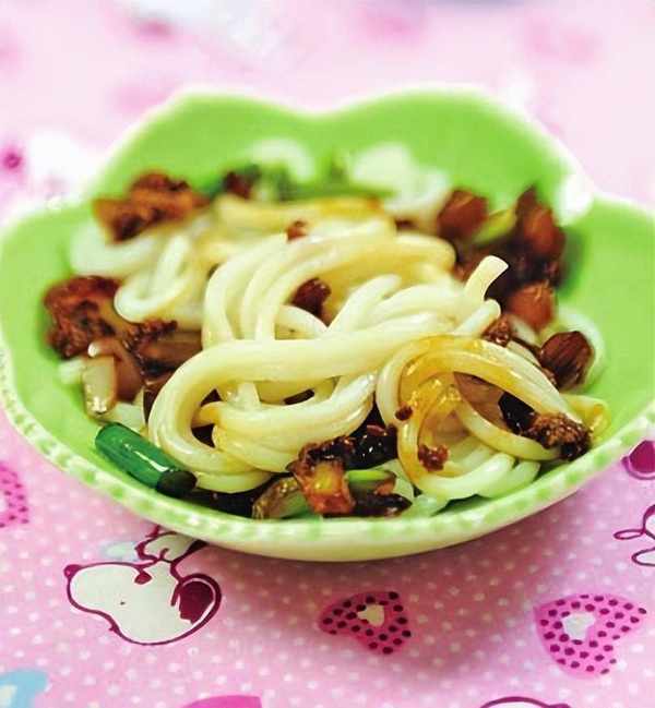 5.把米粉撈出放在盤中,調入炒好的醬料,拌勻即可。