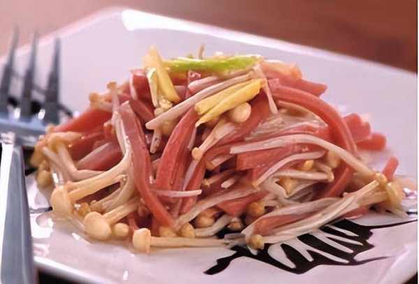 原料:金針菇 150 克,熟火腿絲 30 克。