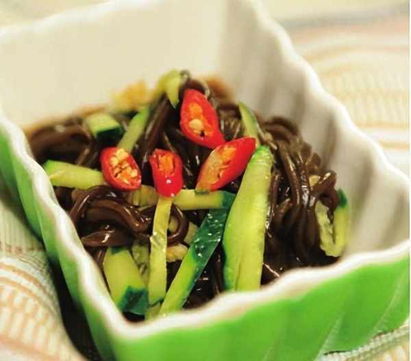 做法:1.黃瓜洗凈切絲;蕨根粉放滾水內煮 7 分鐘左右,註意攪拌,以免粘鍋;辣椒切碎。