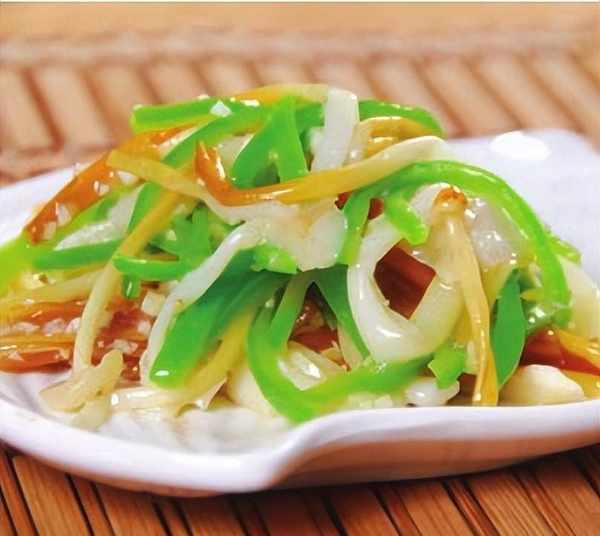做法:1.金針菇切去老根,洗凈後擠去水分;青椒洗凈,切成細絲。