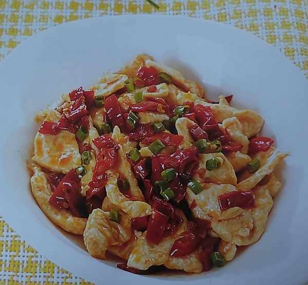 5用辣椒油炒香泡椒,澆在雞片上即可。