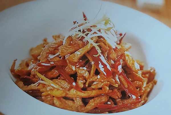 1羊肉洗凈,剔凈筋膜,切成絲。