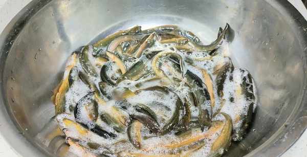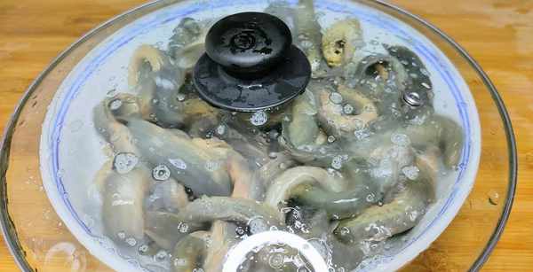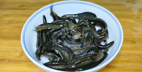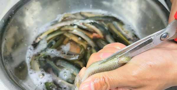 經過5分鐘,現 在的泥鰍大部分已經不動瞭,身上的黏液基本都已經脫落瞭,下面給它倒入一個大盆裡面,在加入一些清水,下面使用雙手把泥鰍用力的抓攥一下,把黏液都清洗出去,這個也是腥味的主要來源,清洗幹凈之後使用一把剪刀,把泥鰍處理一下,收拾幹凈,我們大概給它 處理成像這樣的程度就可以瞭,下面把收拾好的泥鰍放入一個大碗裡面。