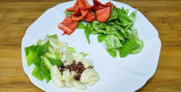 趁醃制的時間準備一點配菜,螺絲椒一根,先切去根蒂不要,去籽之後在切成小塊,切好之後放入盤子裡面,紅椒在來半根,同樣切成小塊,放一點紅椒好看又好吃,切好之後與青椒放入一起。生薑一塊,先切成薑片,在切成薑絲,最後在切成薑粒,切好之後放入盤子 裡面,小蔥白兩顆,切成小段,切好之後放入盤子裡面,大蒜在來個四五瓣,用刀簡單的拍一下,把大蒜拍扁就可以瞭,切好之後與蔥薑放入一起,最後在來一點花椒,好吃又增香。