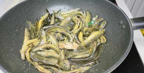 下面的泥鰍也已經醃制好瞭,把裡面的蔥薑都挑揀出去不要,然後鍋中加入一些食用油,油熱之後把泥鰍倒入鍋中,剛倒入的時候不要翻動,先把泥鰍煎一下,然後在輕松的晃動一下鍋,使其受熱均勻,一面煎到三四分鐘左右在給它翻一個面繼續煎,在煎這個泥鰍的時 候不用給它煎的太長時間,全程大概煎六七分鐘就可以瞭,泥鰍煎好之後先盛入大碗裡面備用。