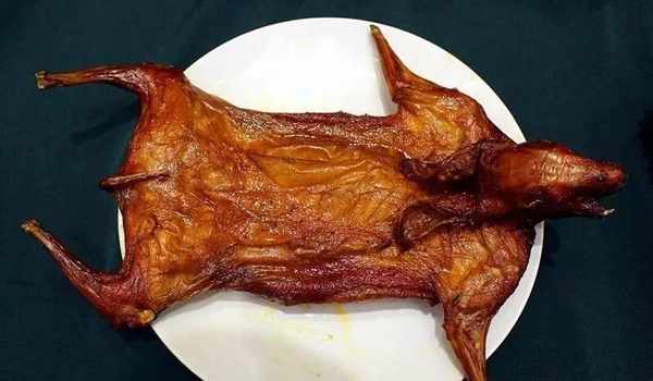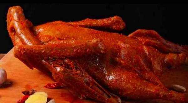 再用托盤襯托塗抹後的鵝放在鍋裡,鍋底預先放有糯米,用文火慢慢烤焦糯米熏烤鵝肉至香味四溢即可。此時鵝皮金黃透亮,加上點點辣椒粉映襯,十分美觀,食之香辣醇厚,已成酒樓宴客佳品。