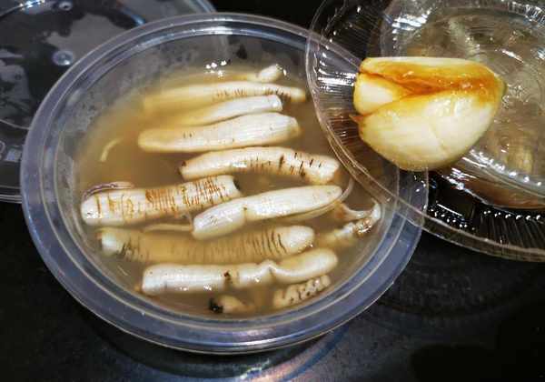 安海土筍凍形圓小略扁,色澤灰白相間,晶瑩剔透,鮮嫩清脆,質地柔韌,富有彈性,味道甘冽鮮美,可配醬油、永春醋、甜辣醬、芥辣、蒜蓉、海蜇及芫荽等佐料。