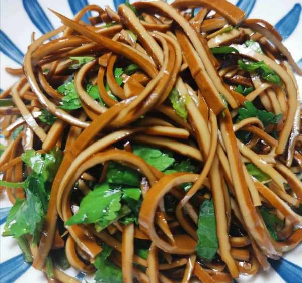 食材:豆皮,香菜,味極鮮,白糖,雞精,花椒油,香油。