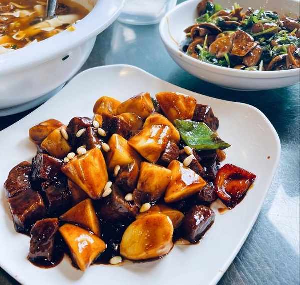 像這個松子牛肉炒年糕,就是以年糕為主,拌上大塊的牛肉粒一起翻炒,以甜味為主,口感濃鬱香甜,年糕和牛肉粒的分量都很紮實,牛肉新鮮味道好,年糕Q彈不會粘牙,軟糯入味特別香,整個口感就是醬香味加黑胡椒的味道,吃起來不管味道和分量,都很符合東北人的喜好。