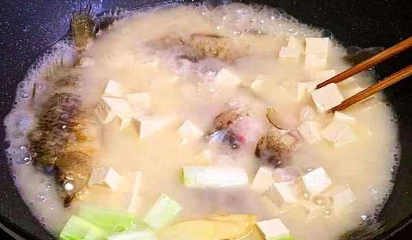 鯉魚炸好後,很多人開始直接加水,鍋裡是冷水。想要湯沒有腥味,就加熱水。不要弄錯這一步。加入熱水後小火慢燉,鯉魚湯中還可以加入一些小菜,比如豆腐、蘿卜等。它們還營養豐富,與魚湯搭配食用味道極佳。魚湯變白瞭。
