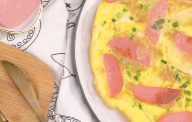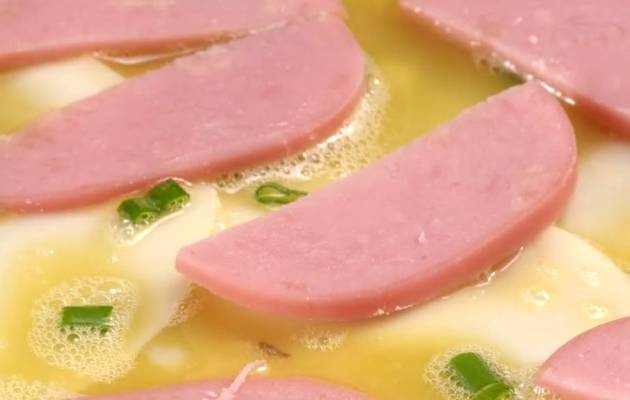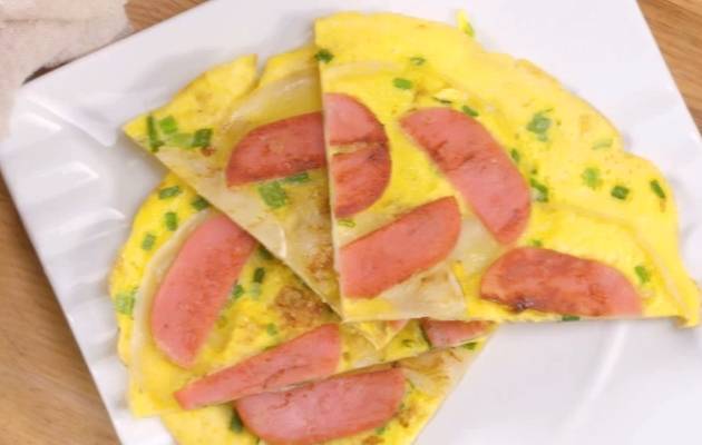 第三步:待表層的雞蛋液尚未完全凝固之時,把準備好的午餐肉片平鋪在表面,蓋上蓋用小火燜一分鐘後,開蓋翻個面,用刷子刷上一層番茄醬或者甜面醬,繼續煎一分半鐘左右就可以出鍋切塊品嘗瞭。