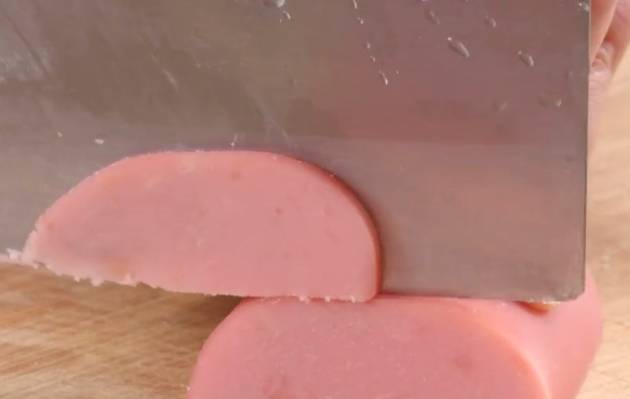 第一步:首先把午餐肉切成薄片,然後對半切開備用,下面這張圖您可以作為一個參考;之後再準備個小碗,加入蔥花,半克的鹽和雞精,三個雞蛋,均勻打散,攪拌備用。