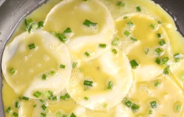 第二步:鍋中加入適量的油,預熱三成熱後,把餃子皮等分三份,每份七張,然後按照下面這張圖的操作,疊加擺出一個梅花的圖形,用中小火煎一分半鐘;之後把準備好的雞蛋液均勻的澆淋在表層,再次煎一分鐘。