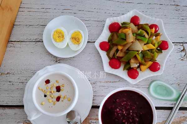 黑米、糯米、小米、燕麥米各10克淘洗後,倒入煮鍋裡,加入2碗開水,100度煮30分鐘,綿糯香濃,色澤黑紅溫暖內心。