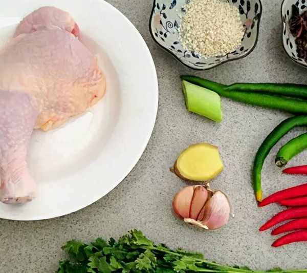 配料:雞腿一隻、大蔥一段、薑一段、大蒜四瓣、青椒四個、小米椒六個、香菜三根、油適量、鹽適量、生抽適量、老抽適量、香油適量、料酒適量、八角兩粒、香葉三片、花椒適量、胡椒粉適量、雞精適量、白醋適量、芝麻適量烹飪步驟:1.準備材料。