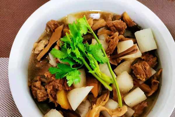 這道菜在冬天吃會更好,冬天吃一般放大紅卞蘿卜。夏天吃放小蘿卜或者白蘿卜會更好。牛肉不分冬夏,它對人的身體都有好處,能夠提高人身體的抵抗力,有強身健骨等作用。白蘿卜的作用就不用說瞭,它富含維生素C,可以生吃,也可以做湯和煸炒,有助消化,清肺止咳,預防冠心病等功效。菌菇類食材對人的身體也有很多好處,這裡就不一一列舉瞭。