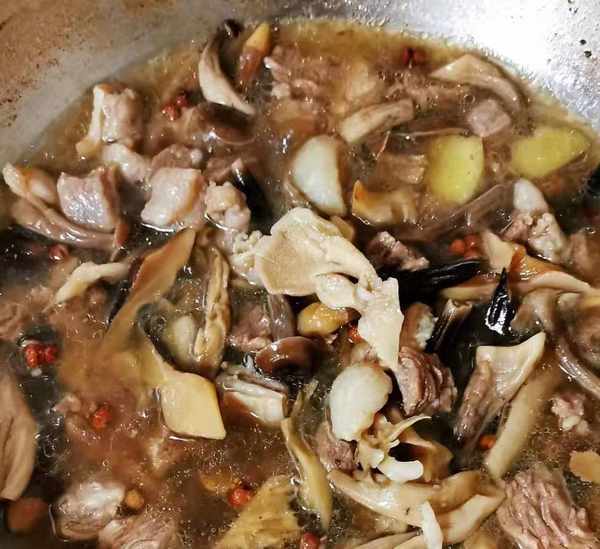 4,將泡軟瞭的鹿茸菇,黑皮雞樅菌幹,舞茸(灰樹花),清洗幹凈,一起放入牛腩中繼續燉煮1.5小時左右。