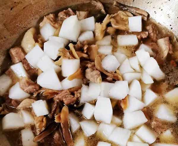 這道菜是我昨天和鄰居大廚微信聊天她告訴我的,我又在她告訴我怎麼做的基礎上,添加瞭幾種蘑菇食材,比隻有蘿卜和牛腩又增加瞭蘑菇的鮮香味道。