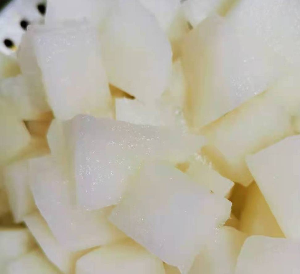5,在燉牛腩的同時,將白蘿卜去皮,切成塊狀,放入鍋中焯水撈出。