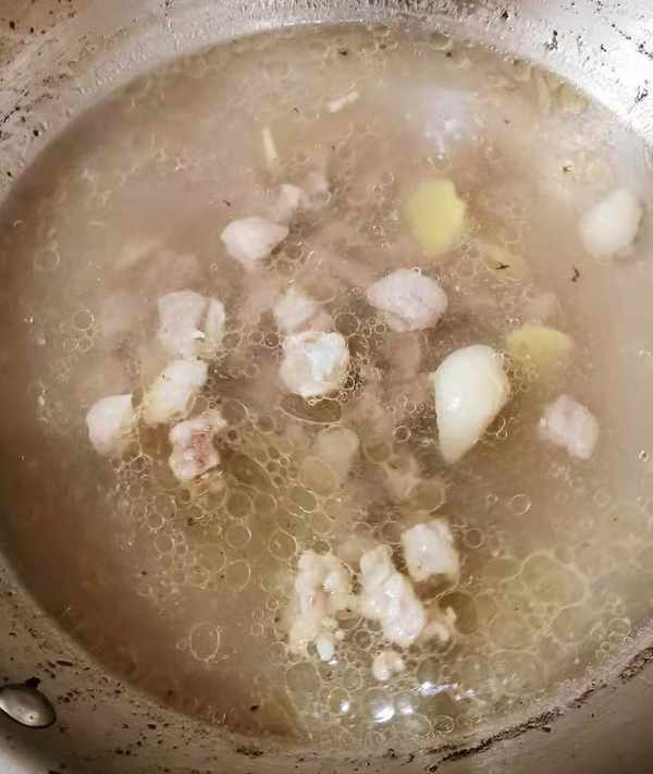 3,鍋中放涼水,將牛腩塊放入鍋中,再切兩片薑放進鍋裡,開大火煮開,撇去浮沫。(我今天買的牛腩沒有什麼浮沫,就貼鍋邊一點。)不要換水,也不放鹽,蓋好鍋蓋,擰小火,放幾粒花椒,慢慢燉煮。