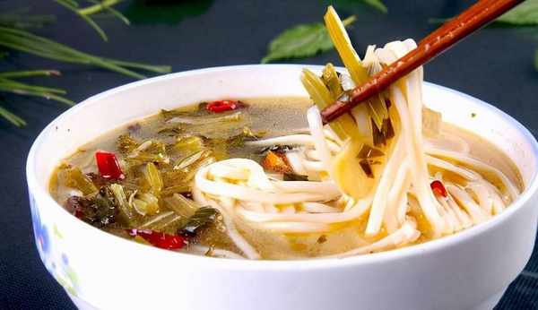 漿水面,相傳該名是由漢高祖劉邦與丞相蕭何在漢中所起,用時令青菜醃制出漿水,手搟細面,調入蒜辣子紅油,令人口味大開,醒酒解暈,清酸爽口。漢中漿水面,其味酸、辣、清香,別具一格,漿水菜的菜以芥菜(花辣菜)為佳。關中的漿水面類似於酸湯面,是夏季常見小吃,漿水菜的菜多為芹菜。