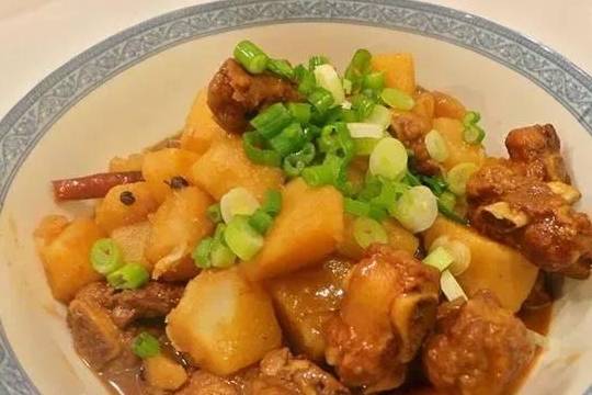 排骨500克,小土豆500克,花椒適量,八角1塊,醬油2勺,蔥1根,薑一小塊,老抽1勺,鹽2勺。