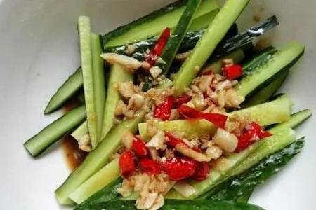 黃瓜、香蔥、幹辣椒、大蒜、蒸魚豉油、香醋、白糖、精鹽、食用油、熟白芝麻