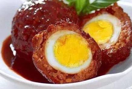 2.將去皮的熟雞蛋分別包入肉餡中,做成5個大丸子。