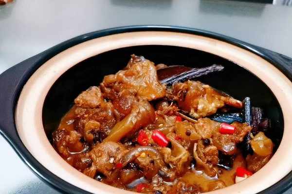 食材:牛筋250克;幹辣椒適量;薑5片;蒜3瓣;生抽2勺;老抽半勺;糖半勺;鹽適量