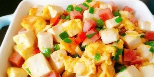 材料:雞蛋;豆腐;火腿;香蔥;料酒;油;鹽;水淀粉