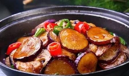 4、放入鮮魚湯大火煮開後,將炸好的茄子放入湯中大火燒2分鐘,鮮魚湯調和作料。放入蠔油、味精、胡椒粉調味同茄子翻炒均勻,最後點綴青紅椒上桌即可。