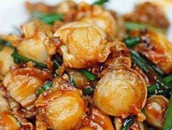 食材:扇貝肉、蔥段、薑片,韓式辣醬3勺、蠔油1.5勺、蒸魚醬油1勺,料酒2勺、糖2勺和米醋半勺、水淀粉