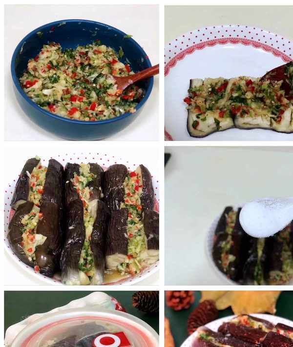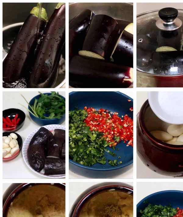 1??洗凈的茄子切段放入蒸鍋中蒸10分鐘。晾涼備用。