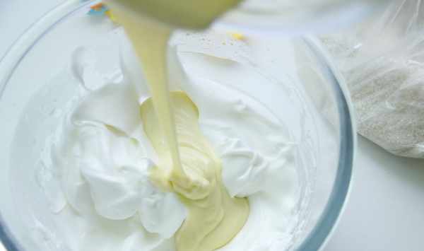 9.再把全部蛋黃糊倒到蛋白霜中。