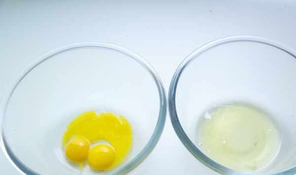 1.盆裡一定是無油無水的,將三個雞蛋蛋清蛋黃分離。蛋清中不能摻有一絲絲蛋黃,不然打發不瞭。(雞蛋提前放冰箱冷藏4小時以上,這樣容易打發。)