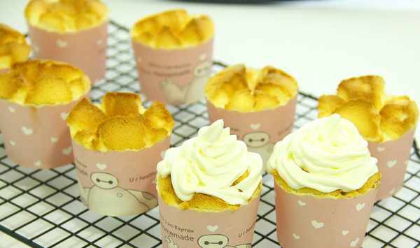 這是一個非常“暴躁”的紙杯蛋糕,因為它炸毛瞭。想節省時間的,因為有大侄兒等著吃,溫度提高時間降低,導致這個紙杯蛋糕有點炸毛。意外的是它還是很好看的,像超級賽亞人,嘿嘿~外觀能接受,面上擠瞭奶油,吃起來跟吃蛋糕一樣,其實也可以用來做蛋糕,這個配料比例可以用6寸的蛋糕模具來做,總之味道非常棒。