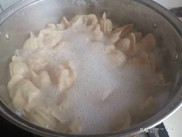 第十步:鍋裏放入清水燒開,煮上餃子,用勺子輕輕推動防止餃子粘鍋,蓋上蓋子大火煮開,撒上冷水,蓋上蓋子繼續煮,如此重複3次,餃子就熟透了。