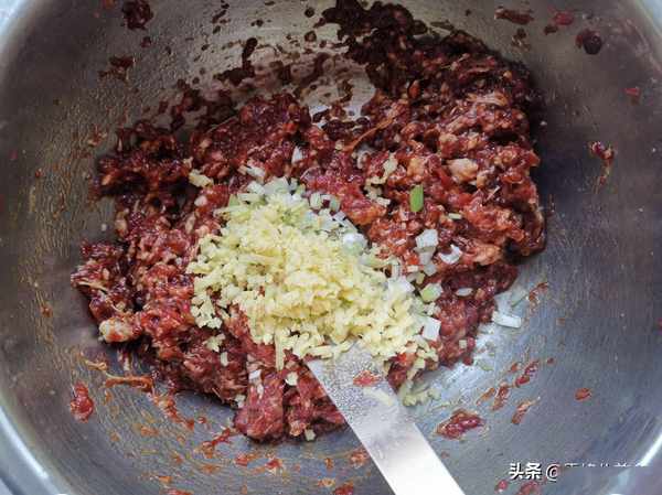 第四步:肉餡加入醬油和鹽攪拌上勁,加入花生油拌勻,最後葱末薑末拌勻。