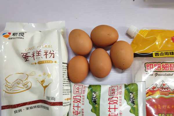 低筋粉90克,砂糖80克,雞蛋5個,牛奶60克,玉米油50克。