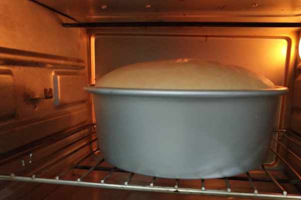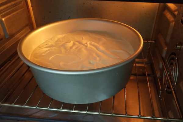 蛋糕在烤箱中烤25分鐘左右的時候就長高瞭,像這樣高出模具,鼓起一個小山包,說明蛋糕糊沒有消泡,烘烤時間到位並且涼透蛋糕就做成功瞭。