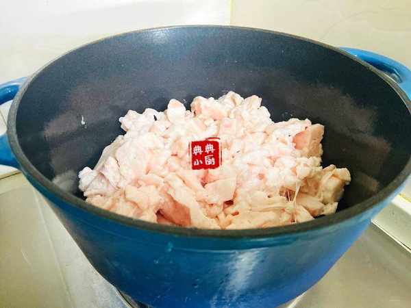 把洗幹凈的豬板油放到鍋裡,我喜歡用深一點的鍋熬油,這樣就不用擔心會濺出來瞭。