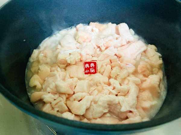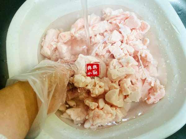 切好的豬板油先用溫水泡一會兒,再用流動的水沖洗幹凈。
