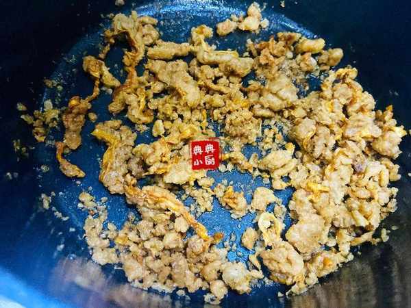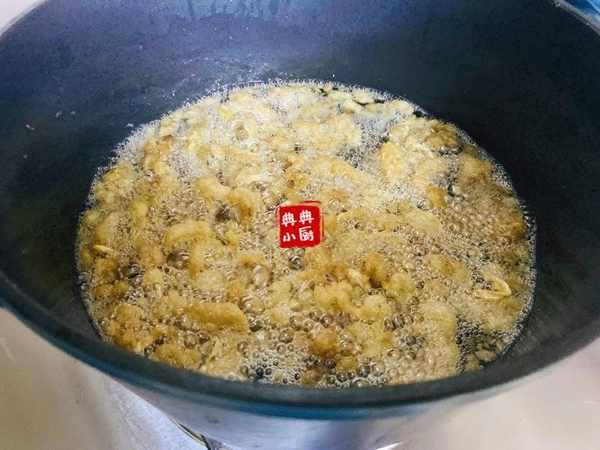 慢慢會發現鍋裡的水分變少瞭,豬板油也開始變色瞭,這個時候記得要時不時用鍋鏟翻一翻,容易沉下去糊掉的。