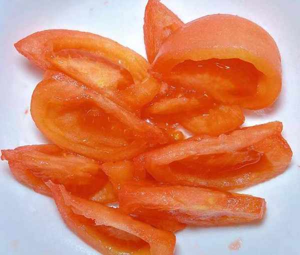 第二:提前燒一些熱水,將番茄頂部切一個十字口子,用開水燙一下外皮,去皮切成塊狀,備用。