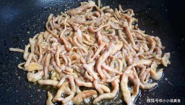 首先,將準備好的瘦肉清洗幹凈,然後切成方塊。切的時候不容易切得太薄,否則會影響口感。肉絲切好後醃制。加入鹽、雞精和味精拌勻。總的來說,調味還是比較不錯的。朋友少的就加鹽,然後拌勻,然後加少許水分3次拌勻,把水抓到肉末裡,最後加淀粉收水。