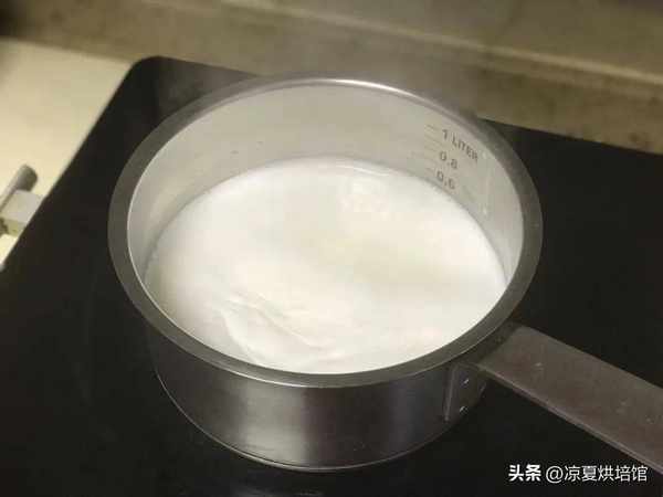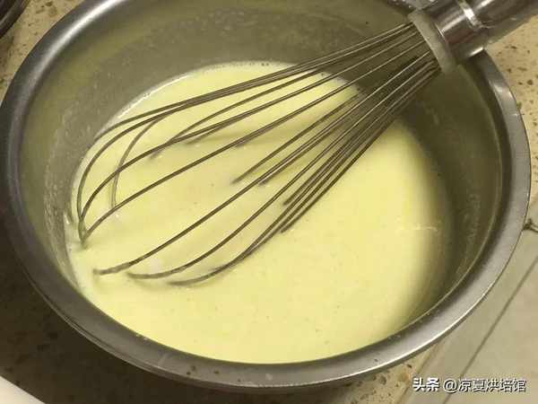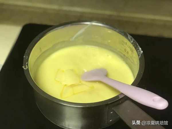 400克牛奶加熱至沸騰關火,然後倒入蛋糊中,邊倒邊攪拌均勻,開小火加熱至蛋奶糊黏稠。加入黃油用餘熱融化並攪拌均勻
