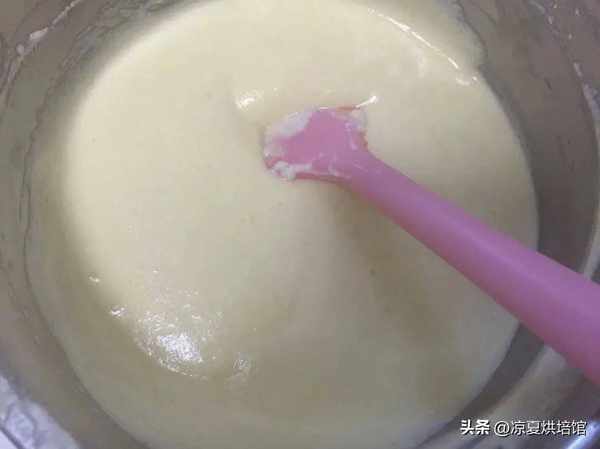 將打發好的蛋白分三次加入蛋黃糊裡,每一次都要攪拌均勻。拌好的面糊即北海道戚風蛋糕糊