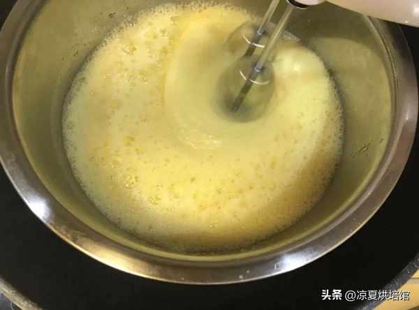 制作蛋糕體:分離蛋黃蛋白,蛋黃加入植物油、細砂糖、牛奶攪拌均勻