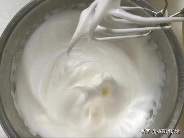 蛋白加幾滴白醋或檸檬汁,分三次加入細砂糖,用打蛋器打發至濕性發泡,即提起打蛋器出現大彎鉤即可